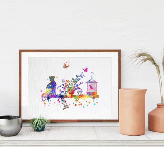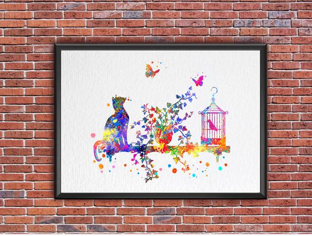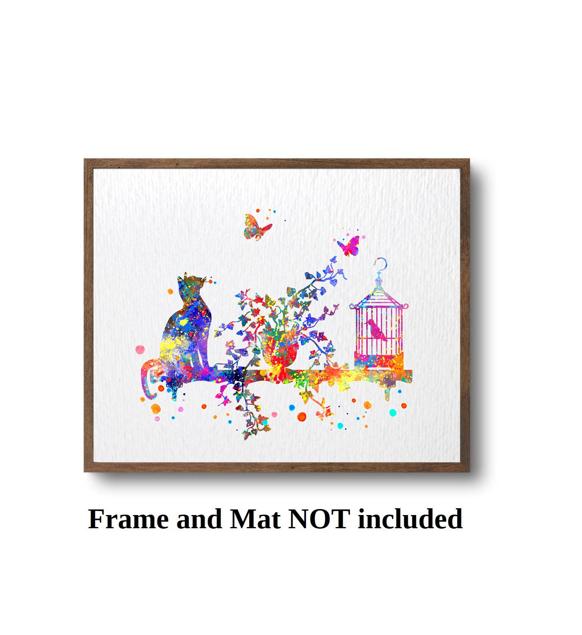 Dignovel Studios Unframed Cat Birdcage and Butterfly Watercolor Print Hanging Home Decor Nursery decor Kids Fine Print Motivational N120 Watercolor Art Print Wall Art Poster Home Decor Hanging DN120